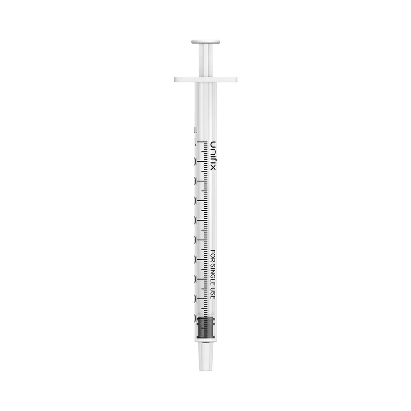 Unifix 1ml Luer Slip Syringe with a smooth rubber plunger for precise, controlled injections. Features clear graduations, secure Luer Slip fitting, and individually sterile blister packaging. Compatible with all standard detachable needles and made from high-quality, medical-grade materials.